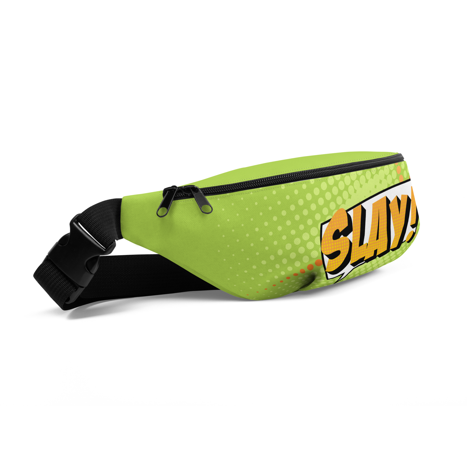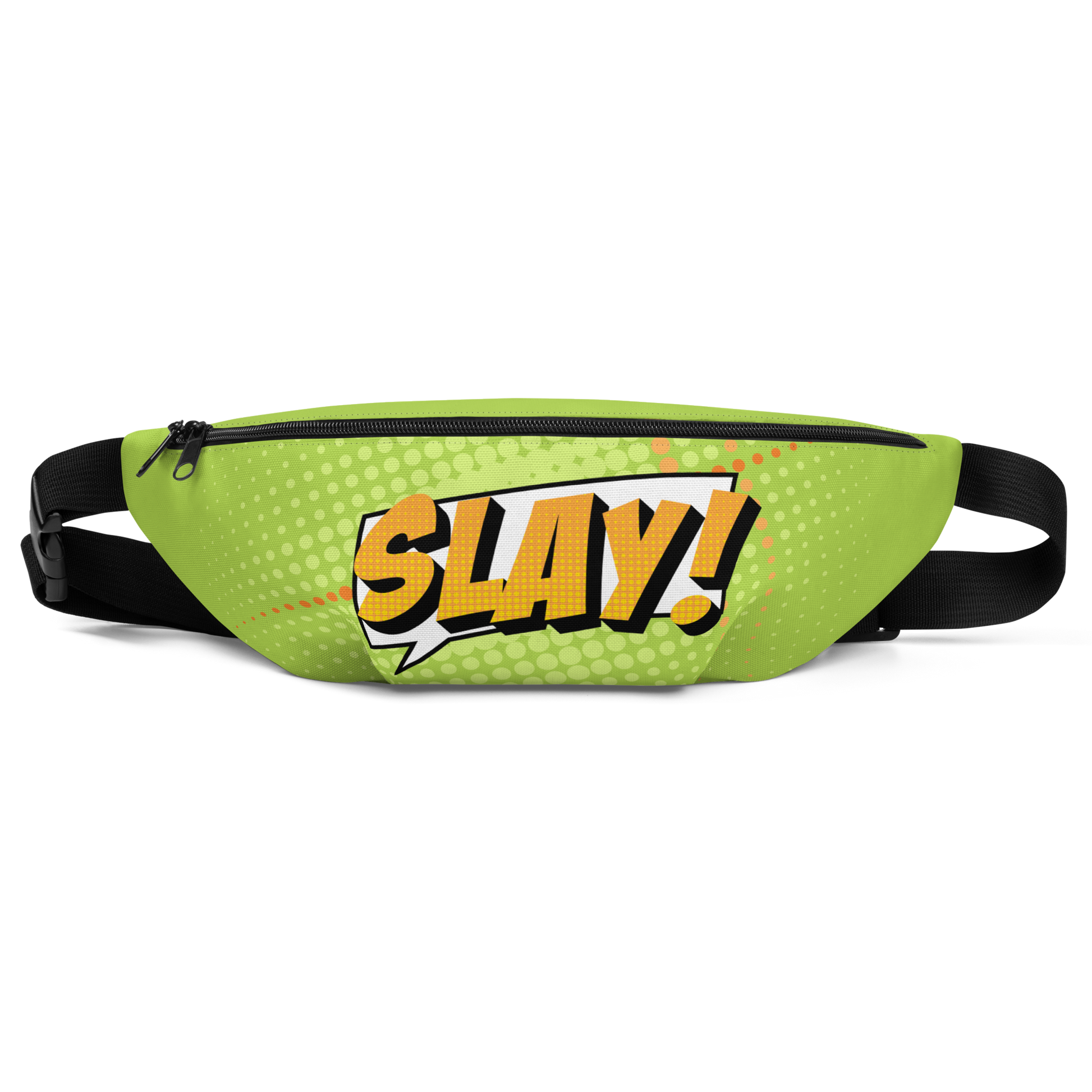 Leuchtendes Neongrün, auffällige Comic-Dots und das fette gelb-orangene „SLAY!“ sorgen für maximale Wirkung.